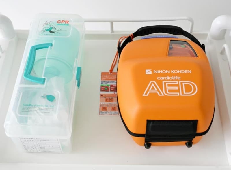 心臓がけいれんした状態(心室細動)に、電気ショックを与えて正常なリズムに戻すための医療機器です。